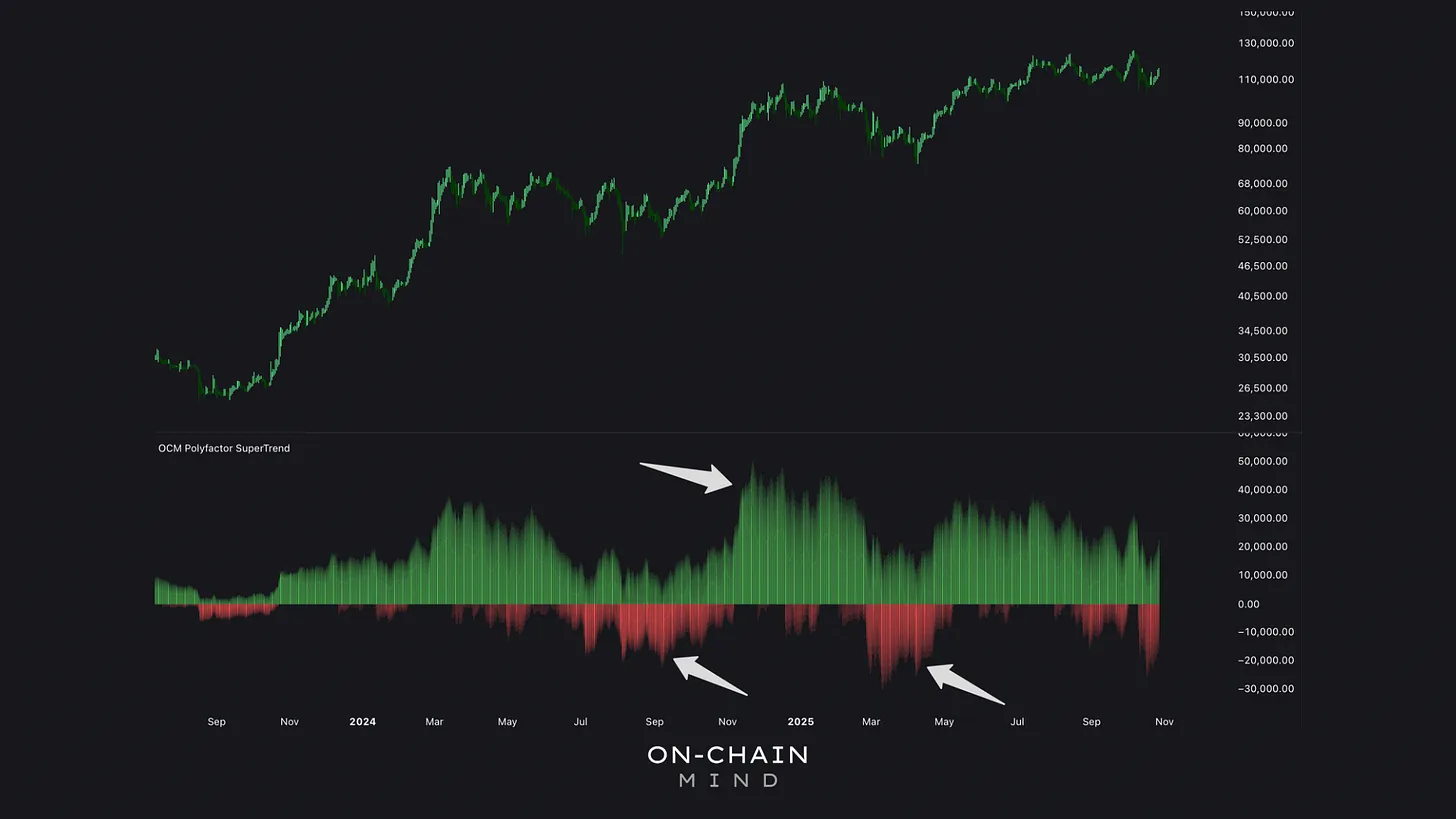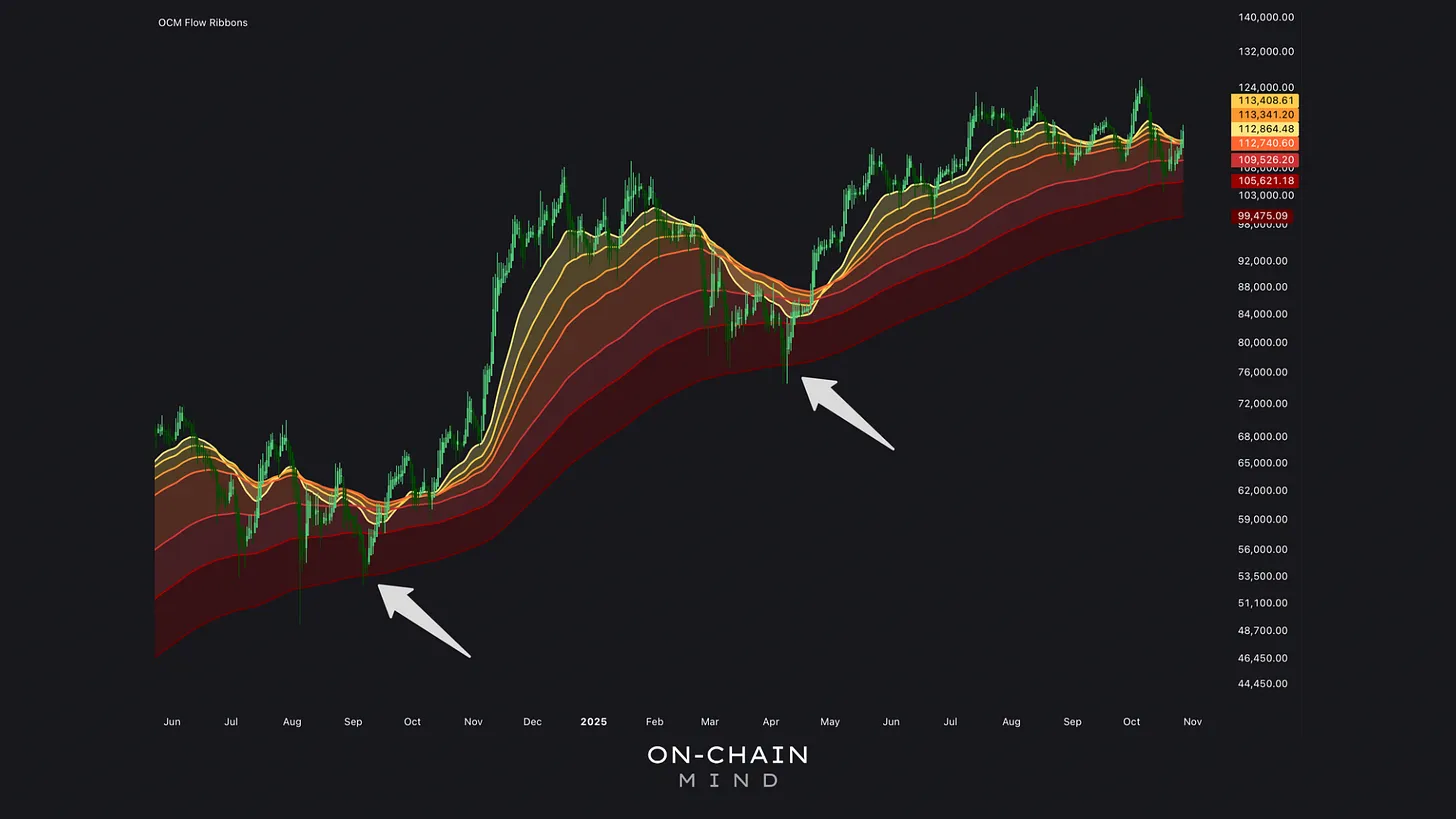 The bottom ribbon (now just shy of $100K) forms a crucial structural boundary. Losing this would mark a true shift in market character. But as of now, the Flow Ribbonsremain upward-sloping, signalling that the macro trend is still predominantly bullish.