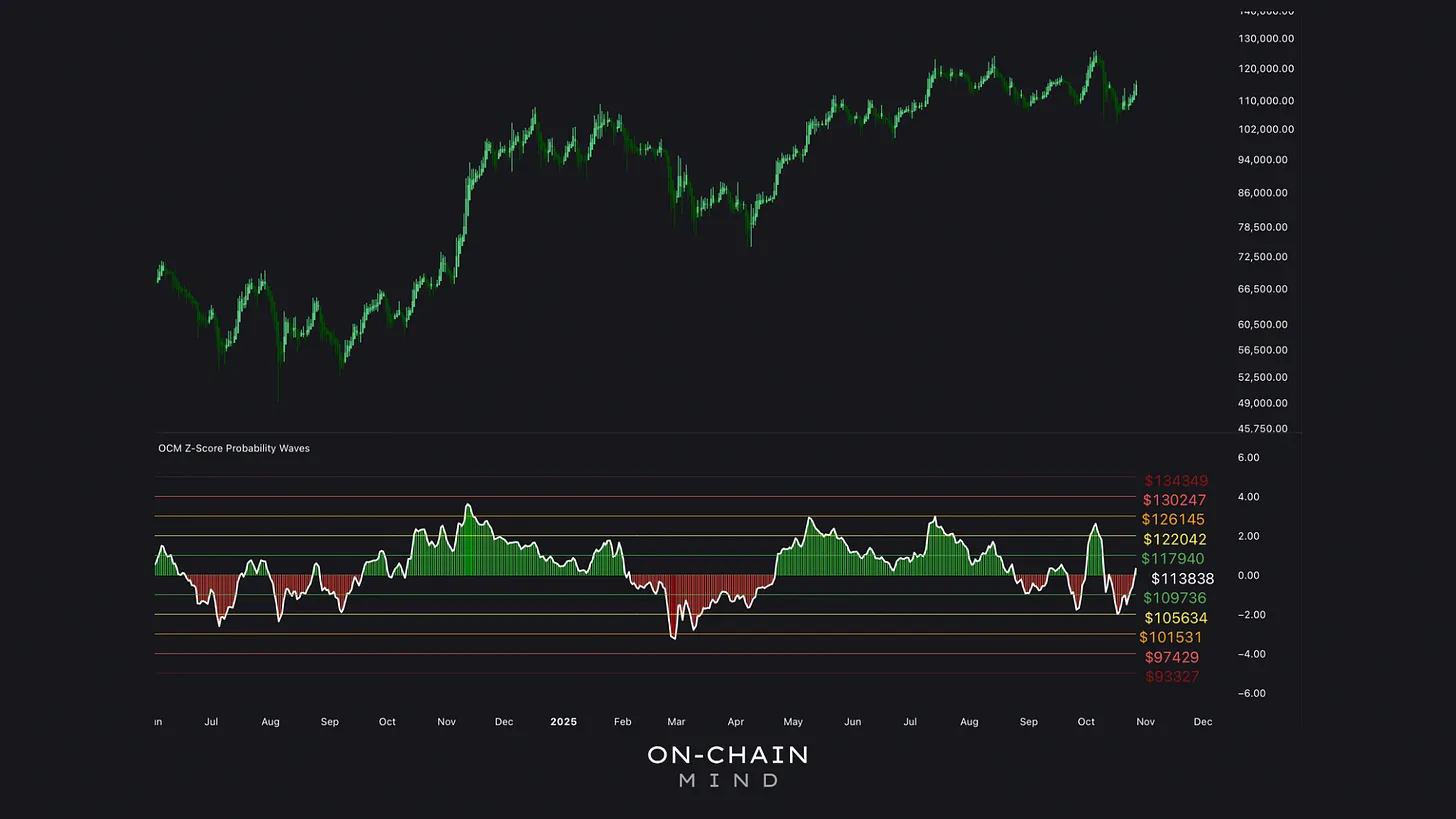 +1σ: ~ $117K — the critical level for bullish breakout confirmation.