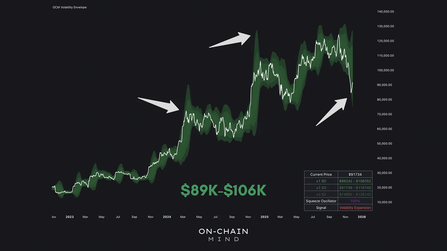 Historically, the fastest 30–40% band expansions in this cycle have always been followed by sharp mean-reversion moves. We just witnessed the largest downside expansion since early 2023. And now price is sitting near the lower edge of the post-expansion 1σ envelope ($89,000–$106,000).