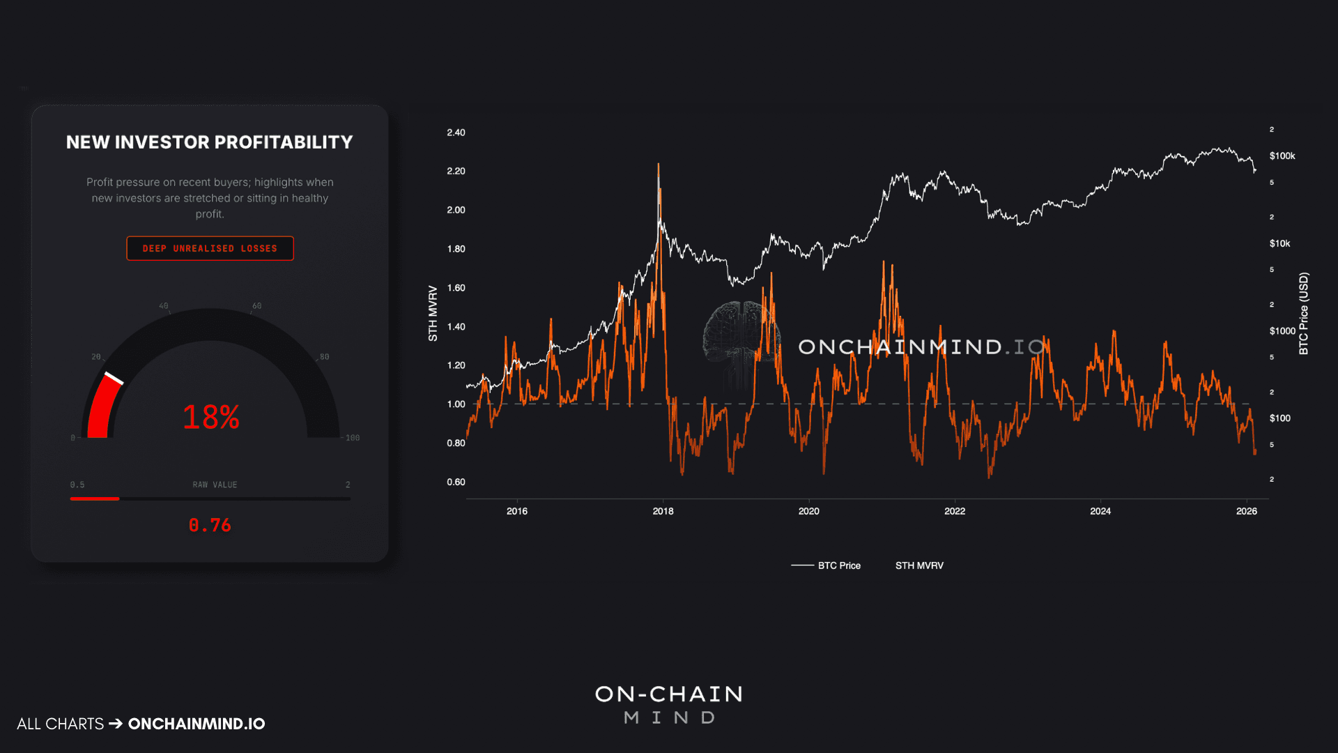 New Investor Pain: Short-term holders are currently facing deep unrealised losses, placing current profitability in the bottom fifth of Bitcoin's entire trading history.