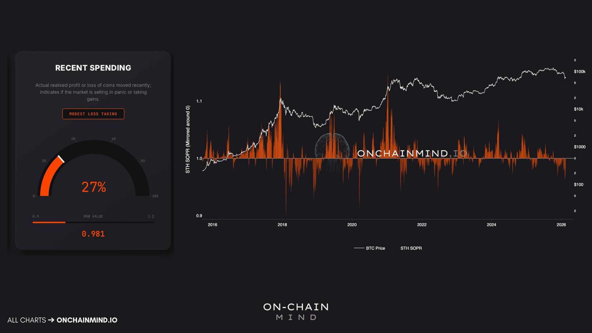 While unrealised loss tells us how much people feel the pain, Recent Spending tells us what they are actually doing about it. Currently, we see a score of 27% on Recent Spending. This is classic modest loss-taking territory. There is controlled bleeding in the system, but we are not yet in full-blown haemorrhaging mode (yet).