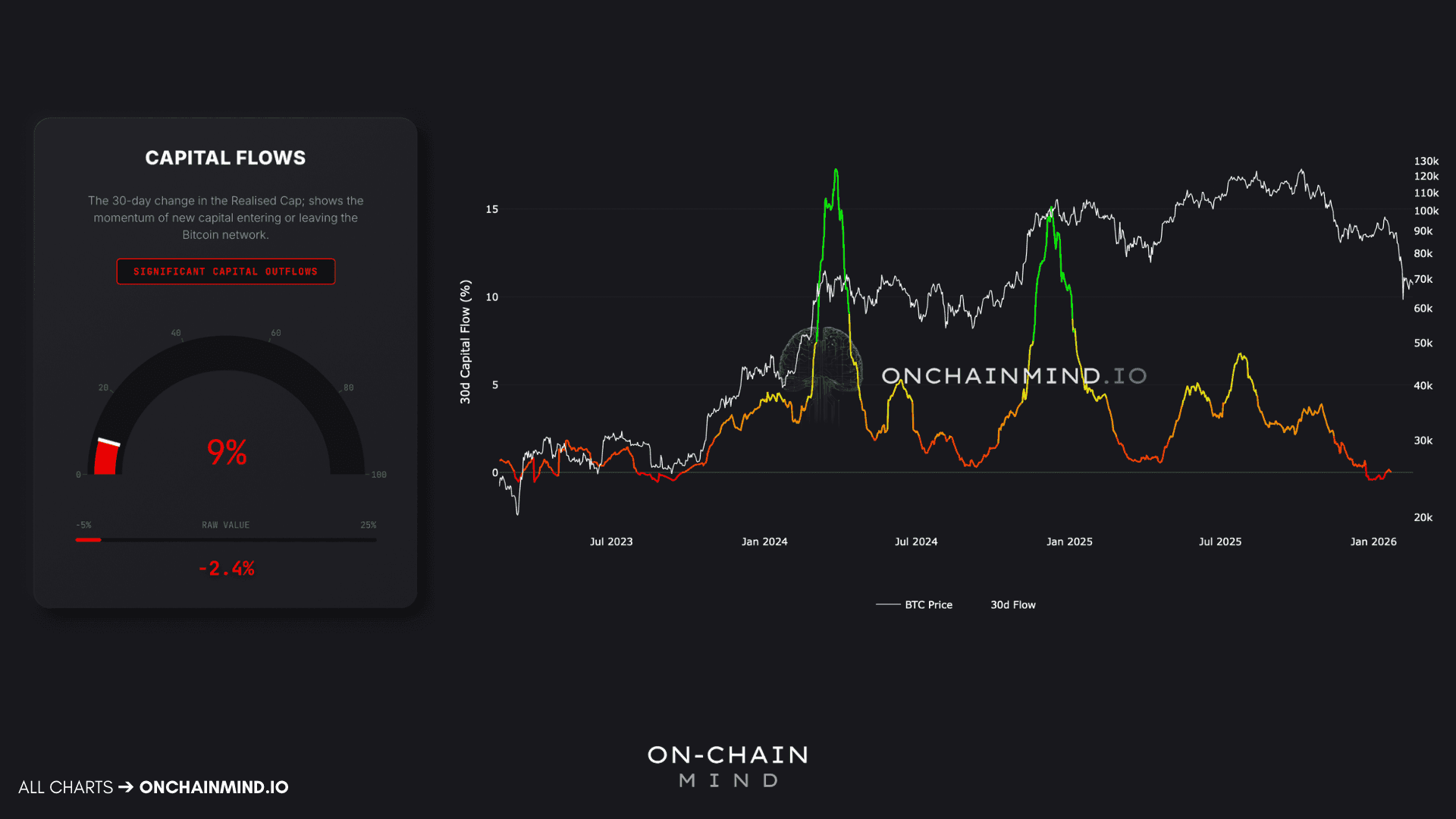 When the Realised Cap rises, new money enters and coins are repriced higher. When it falls, coins are leaving at lower prices and committed capital is shrinking. Right now, the 30-day change in Realised Cap sits at -2.4%, with a Capital Flow Score of 9%.
