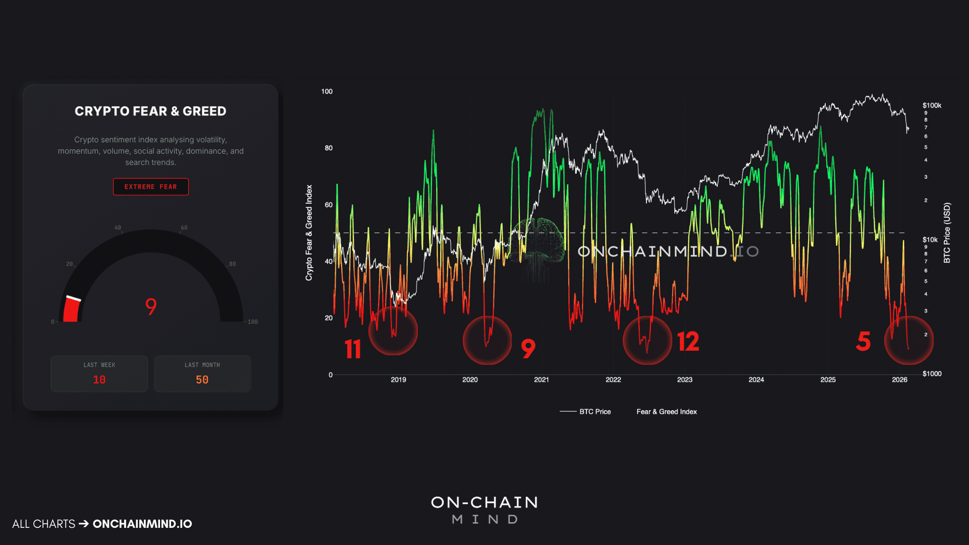 Extreme Sentiment: The Fear and Greed Index has plunged to a reading of 9, matching the historical lows seen during the bear market bottoms and COVID crashes.