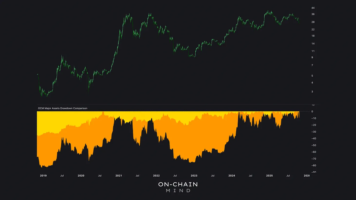 Gold’s drawdowns are typically shallower and slower, averaging 20-30% in major corrections. Bitcoin, by contrast, endures brutal swings: 50-80% drawdowns in cyclical bear markets.