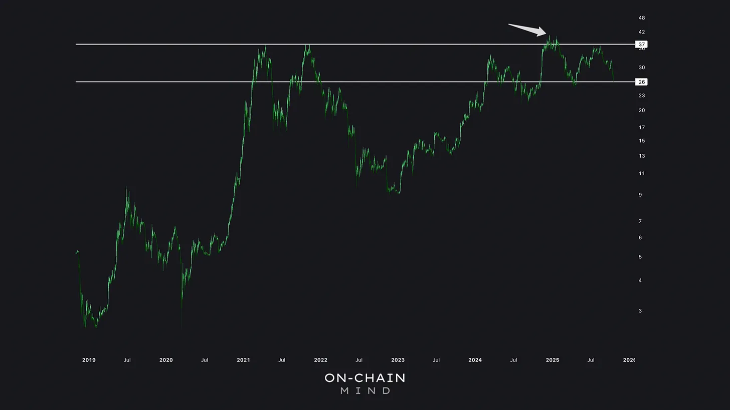 The BTC/gold ratio briefly peaked during the post-election rally in late 2024, but it quickly corrected, bringing it well below that previous high. This means that Bitcoin is still currently cheaper relative to gold than it was at the peak of the last cycle.