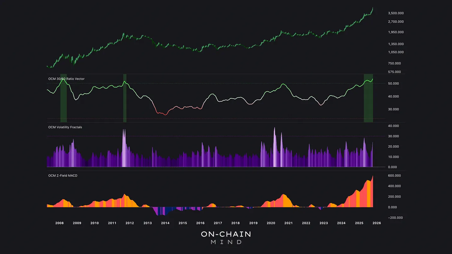 These metrics don’t predict outcomes; they frame probabilities. Acting impulsively on every signal is how gains are lost. With the Volatility RoC still quiet, diving in all at once could easily leave you wishing you’d waited. That’s why I always advocate a slow, reverse-DCA approach, gradually rotating into Bitcoin while trimming gold exposure. It spreads risk across time, not price, and keeps emotion out of the equation.