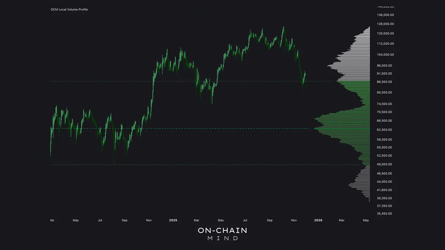It currently sits near $56,000 but is rising steadily. If price falls lower over the next several months, the Realised Price is likely to climb toward the same $63,000 region that houses the POC.