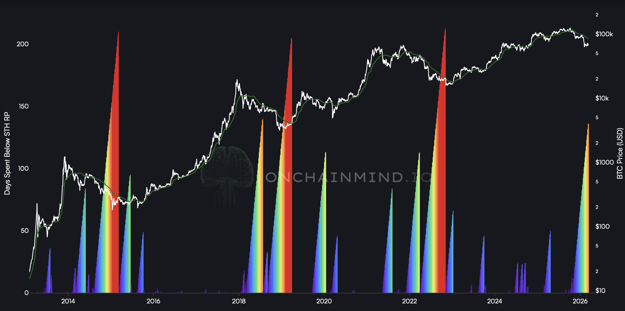 This isn't about the entire downtrend from the all-time high; it’s specifically counting the number of consecutive days price remains below the STH Realised Price (the average on-chain cost basis of new market entrants).
