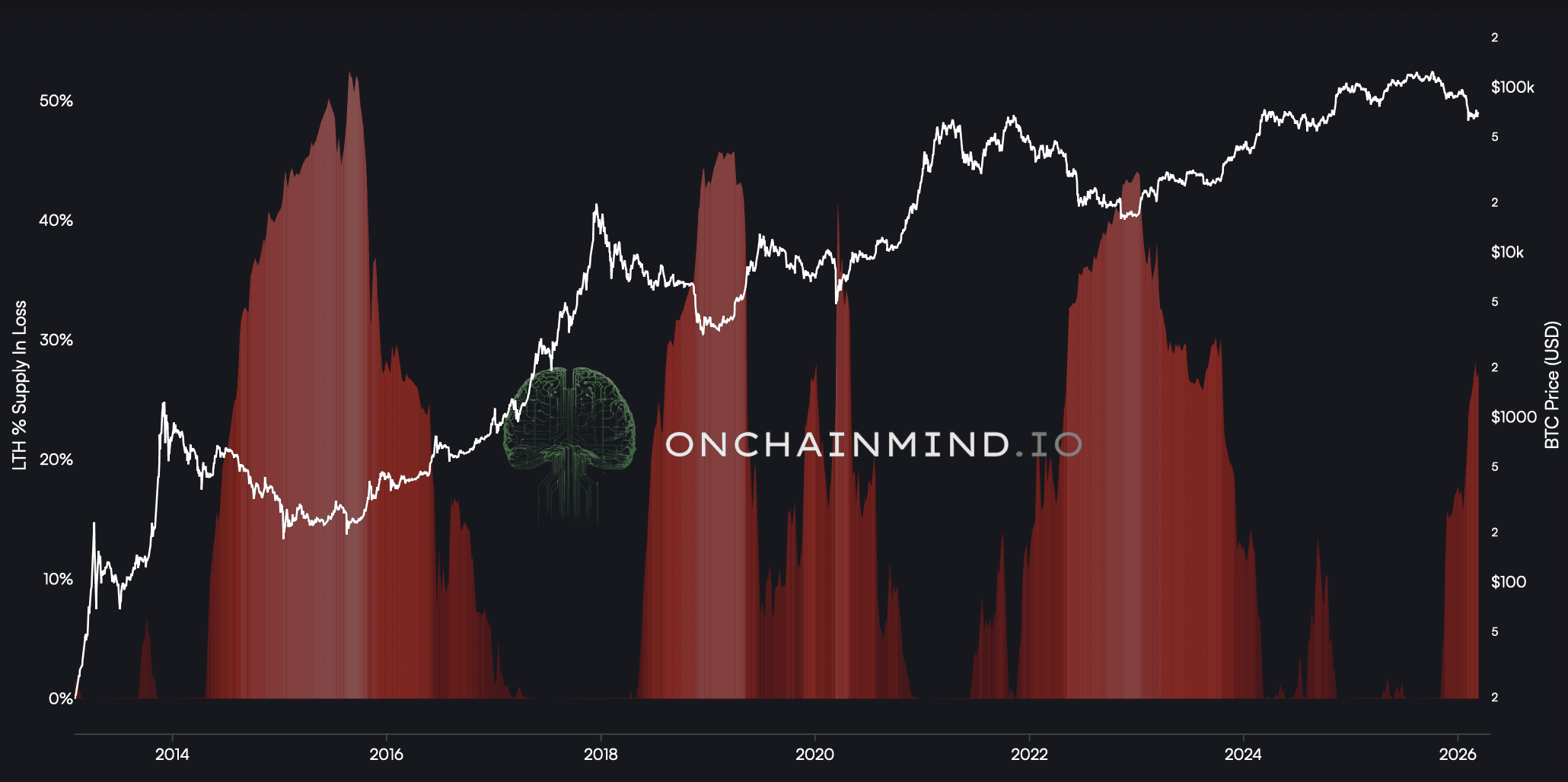 These are investors who have held their coins for extended periods, often through multiple cycles. One of the most revealing signals within this cohort is the % of long-term holder supply currently sitting at a loss.