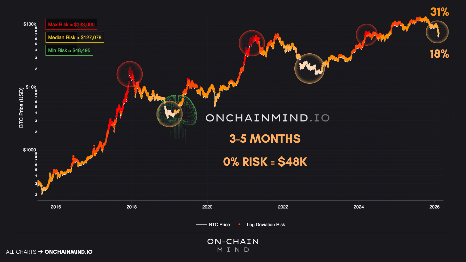 Interestingly, the theoretical minimum Logarithmic Risk level around $48,000 aligns almost perfectly with the pessimistic on-chain floor. When independent models — one derived from investor profitability, the other from logarithmic price structure — converge on the same region, that’s not coincidence. That’s confluence.