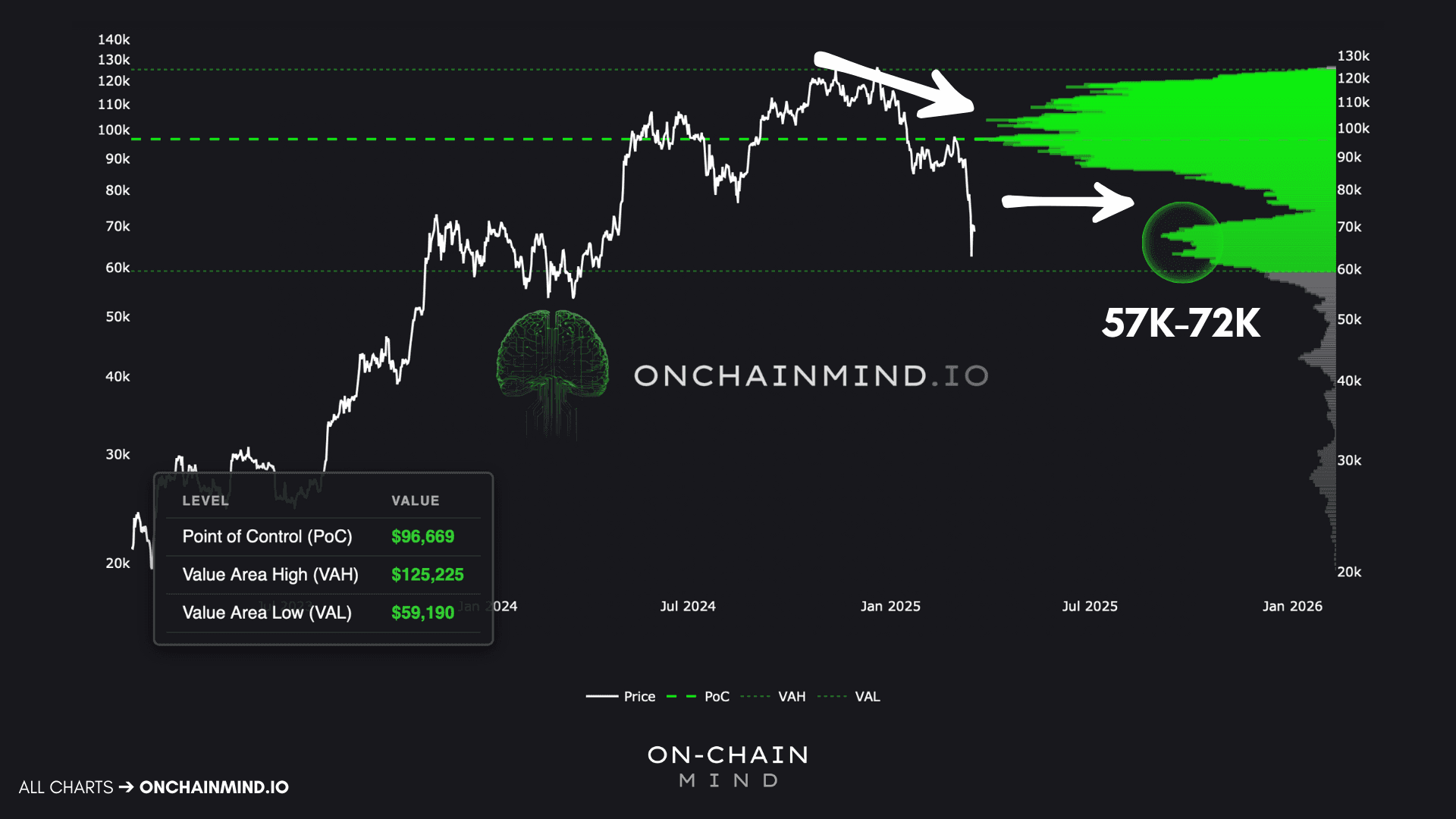 This is how markets behave. These voids act like vacuum tubes; price tends to slide through them rapidly until it hits a high-volume node. We have now landed in a massive cluster of historical interest spanning from $57,000 to $72,000. This is where the market has found acceptance before, and it is where I expect volatility to compress as a floor is hammered out.