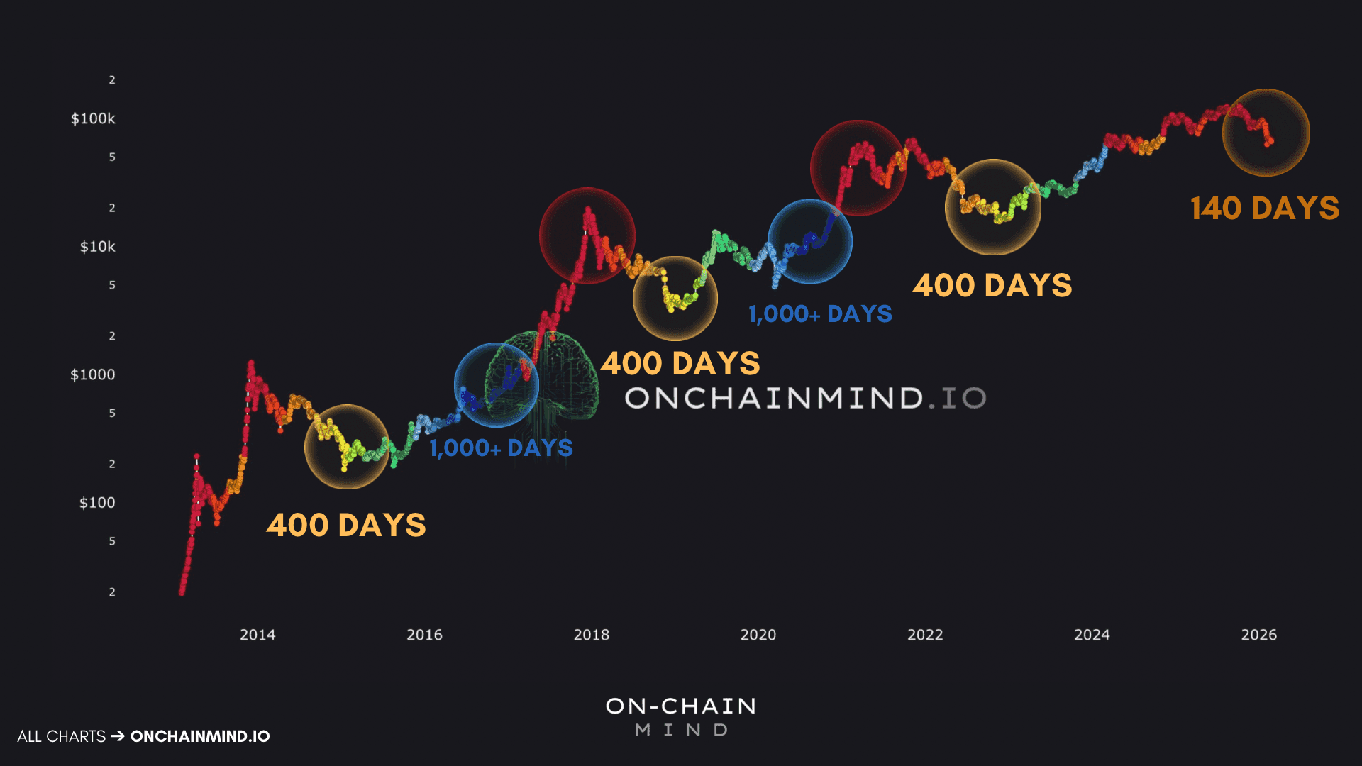 Historically, major cyclical bottoms have often formed around 400 days after the previous all-time high. In some cycles, it has taken over 1,000 days just to reclaim prior peaks.