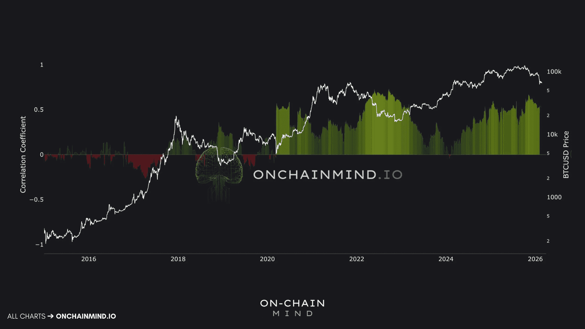 More importantly, the highest sustained peaks in correlation have aligned closely with Bitcoin bear markets. In 2018, we saw the first major sustained sign of positive correlation. March 2020 delivered another spike during the liquidity crunch. The 2022 bear market showed the largest sustained correlation period on record. Over the past couple of years, correlation has gradually crept higher again.