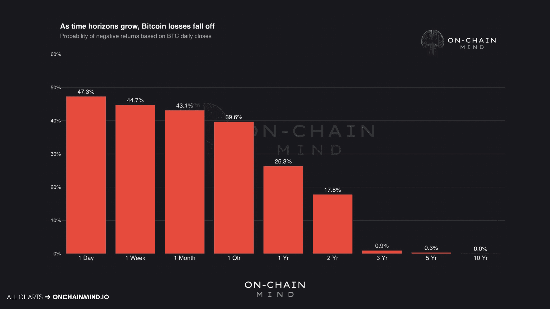 Now consider three years. Across any rolling three-year period in Bitcoin’s history, the probability of being at a loss falls to approximately 0.9%.
