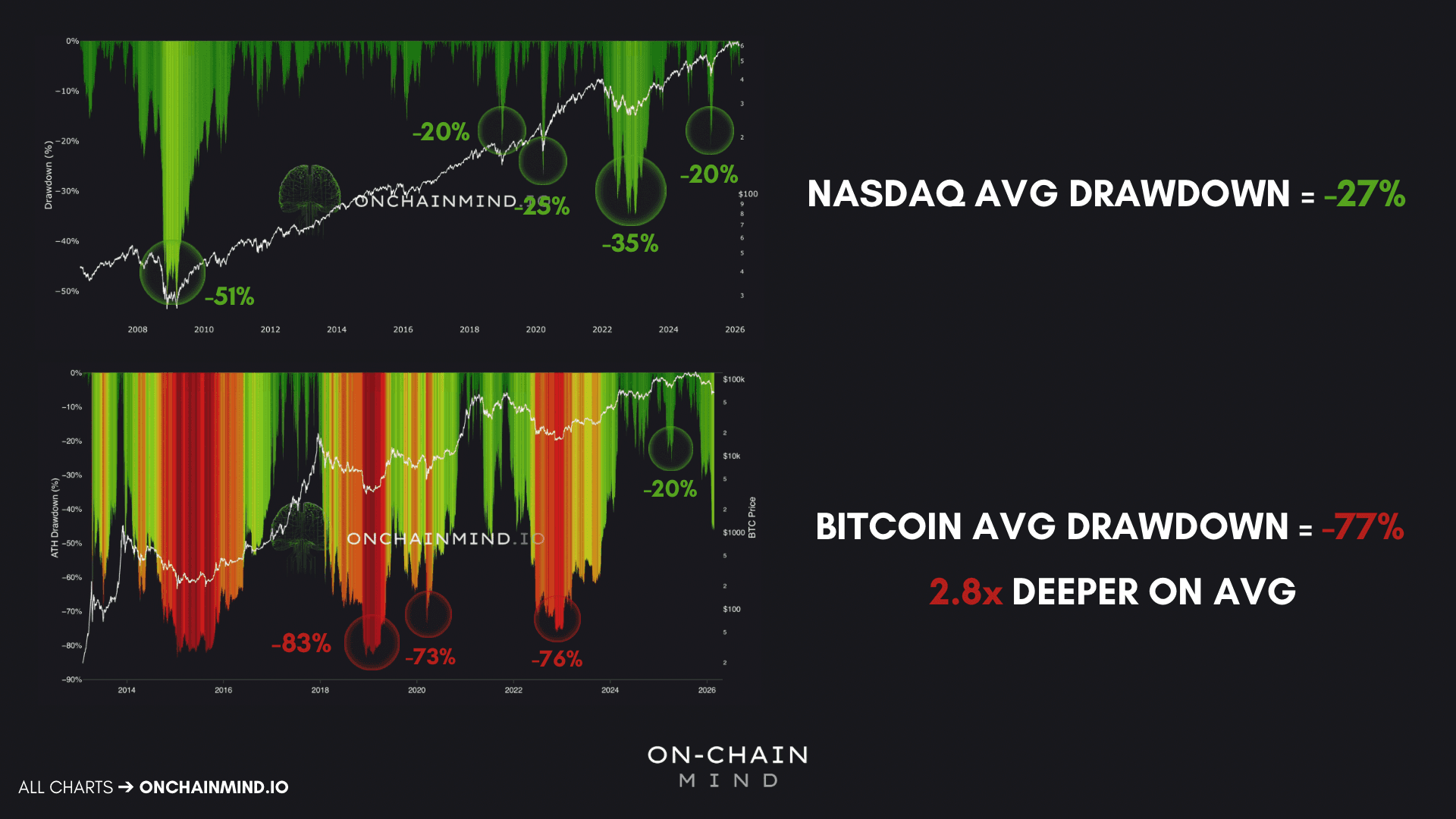 Across these windows, the Nasdaq’s average drawdown was about 27%. Bitcoin’s average drawdown was roughly 77%. That implies an average multiplier of ~2.8x.