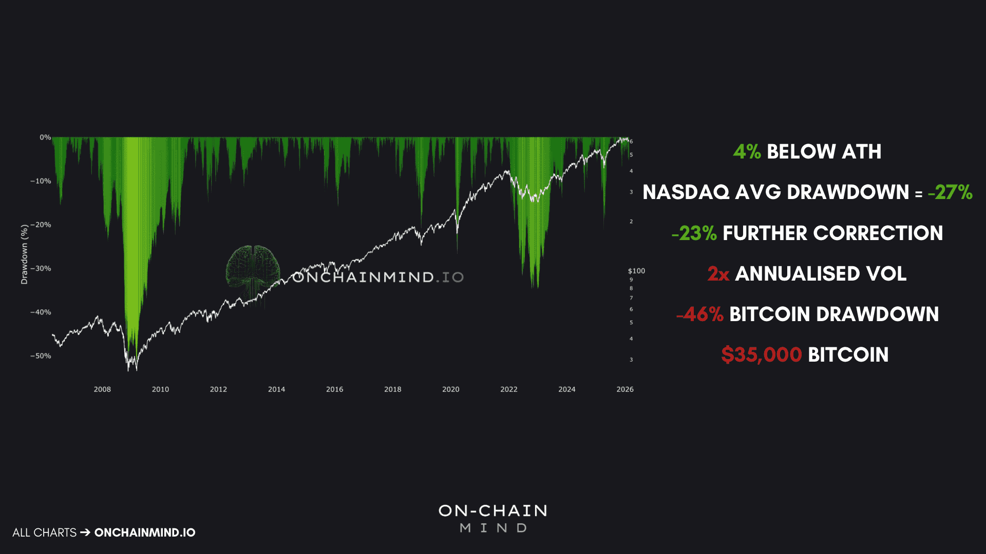 Historical drawdowns reinforce this point. Staying within the post-2008 monetary regime, where quantitative easing and liquidity injections became standard policy, the largest corrections for the Nasdaq (and it’s corresponding Bitcoin correction) have been around: