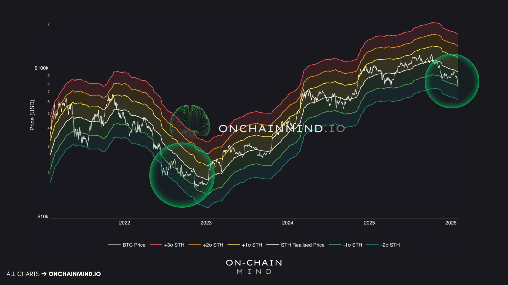 The green band represents roughly 1 standard deviation below the STH cost basis.