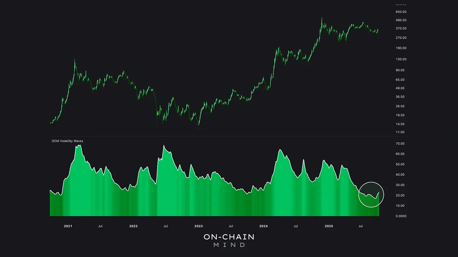 Michael Saylor often says, “volatility is vitality”, and this is especially relevant for MSTR. The Volatility Waves indicator measures the standard deviation of logarithmic returns over a defined period and smooths it to reveal persistent trends.