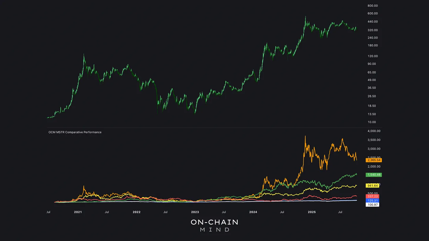 Since adopting its Bitcoin strategy in 2020, MSTR (orange) has outperformed all major assets, including NVDA (green) by a staggering 800%, underscoring the strategy’s robustness.