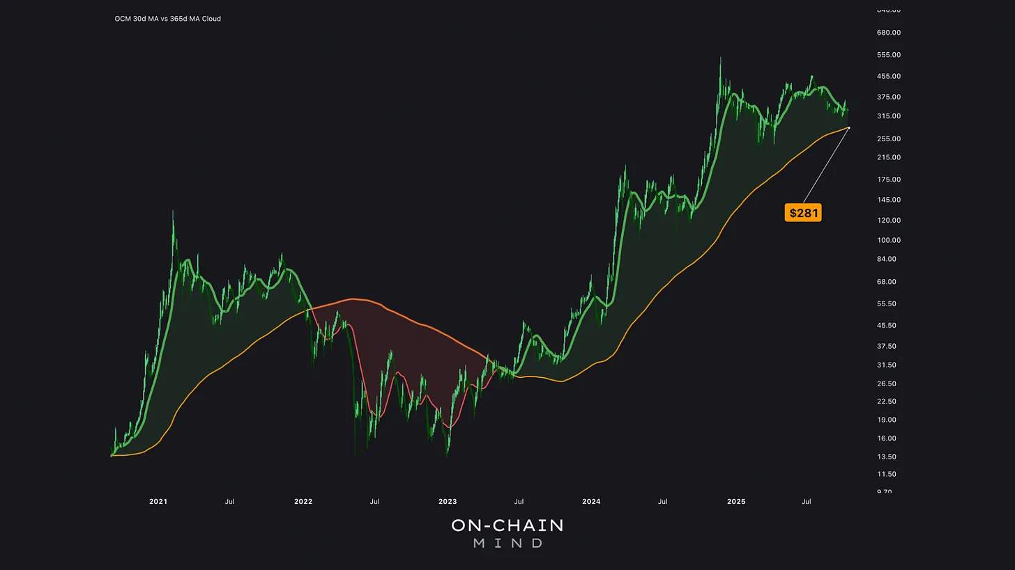 Historically, breaks above the final ribbon have confirmed bullish trends, as we saw in April 2023, while breaks below the ribbon have signalled bearish shifts, such as in January 2022. Currently, the final bearish ribbon sits at $287, and a clean break below this level would indicate a structural shift, forcing a reconsideration of any bullish thesis, even if it pains me to do so.