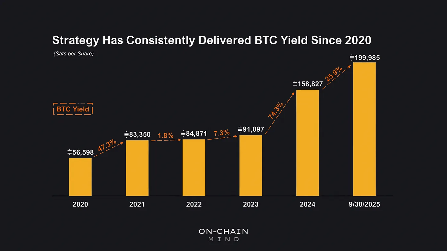 MSTR’s mission is elegantly simple: deliver Bitcoin yield by increasing Satoshis per share.Since 2020, it has achieved this annually through strategic debt issuances, equity offerings, and opportunistic Bitcoin purchases.