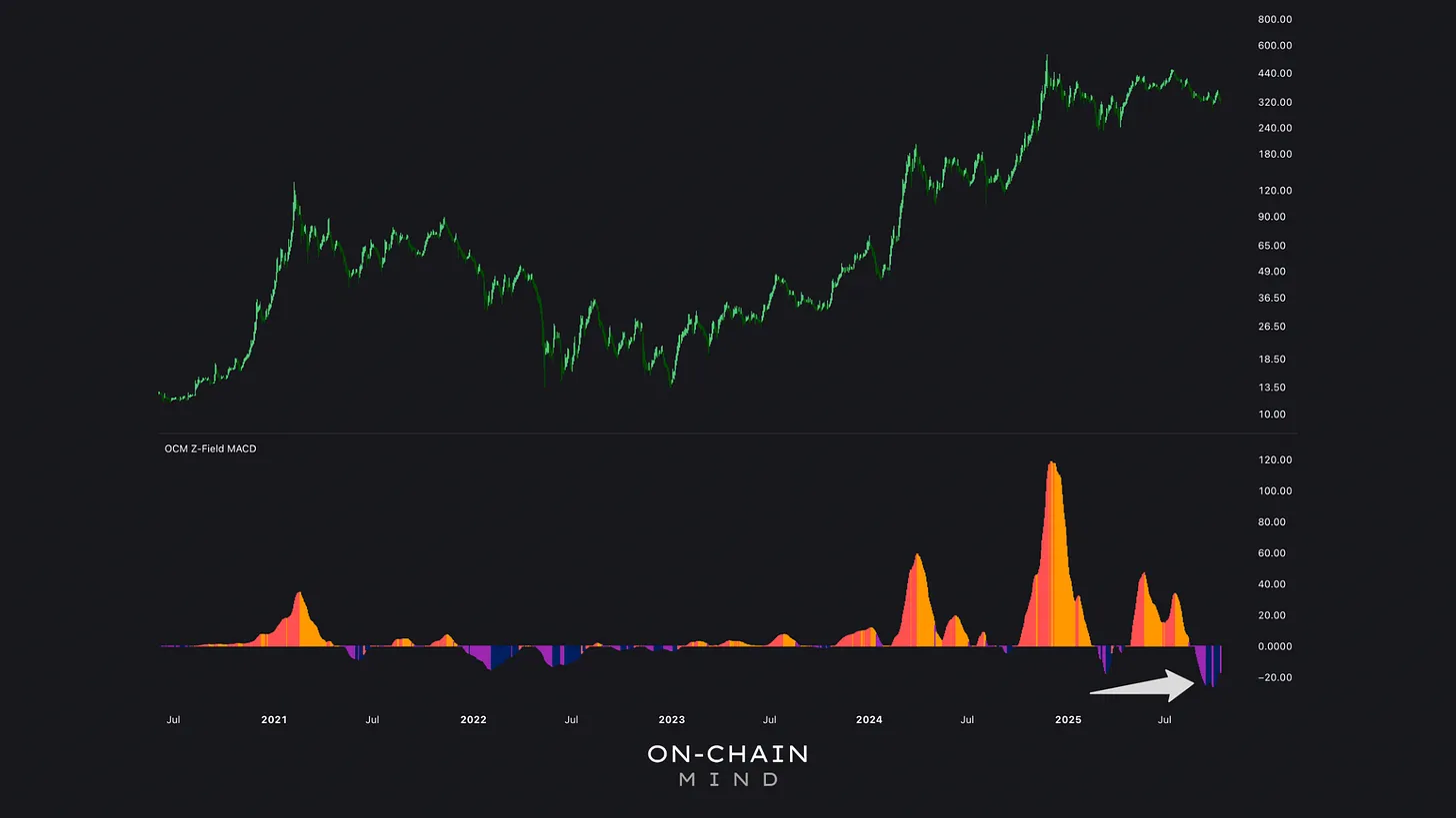 On the bullish side, the historically low momentum readings on the Z-Field MACD, combined with long signals from the Alpha Flow and the first signs of rising volatility, suggest to me that the market is coiled and ready for a meaningful move. I would argue that these aren’t just technical coincidences — they could be setting the stage for outsized returns once conditions shift.