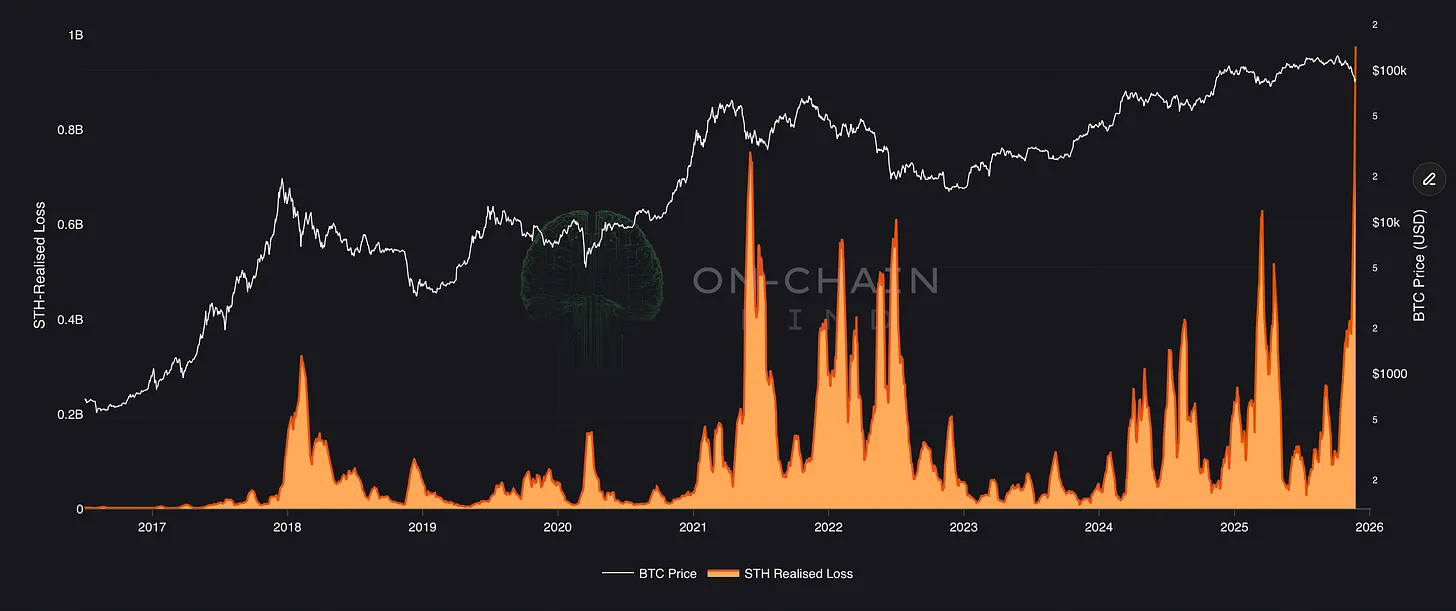 That moment looks like it’s arrived. Bitcoin has recorded the single largest short-term holder loss event in its entire history. And buried inside that pain is a story that tells us far more about where we are in the cycle than price alone ever could.