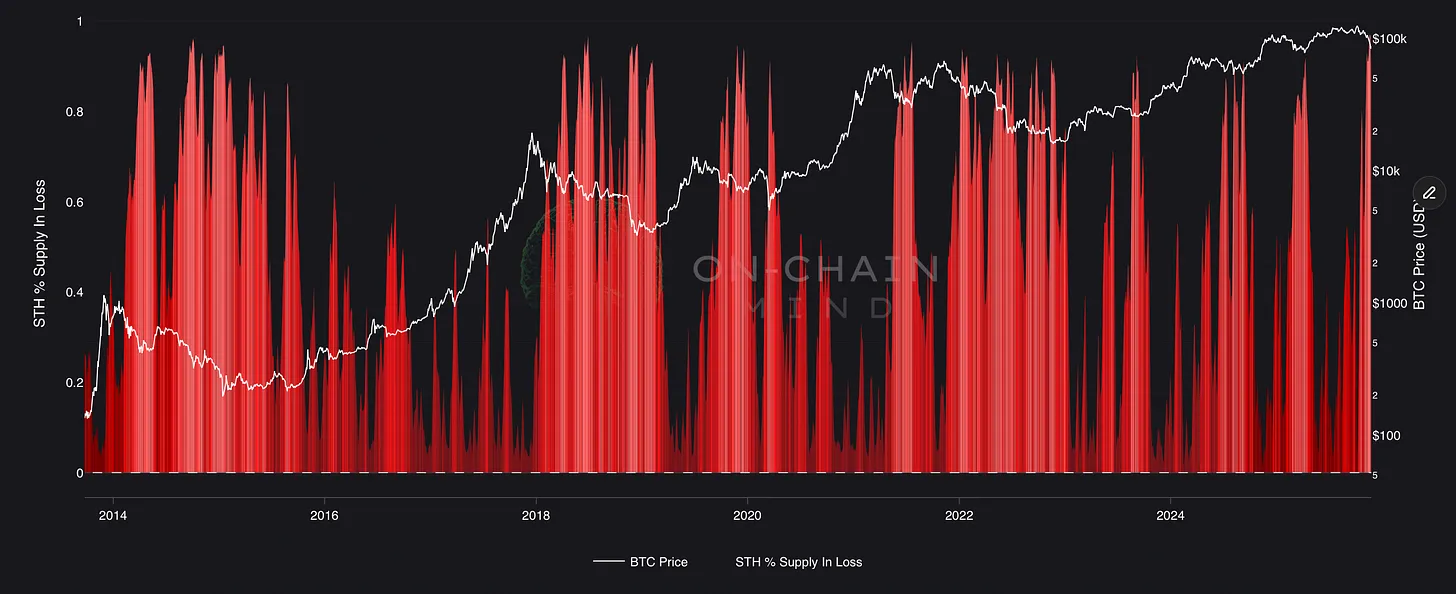 To understand whether this is a short reset or the beginning of a larger structural decline, we need to look at the percentage of short-term holder supply currently in loss. As of now, it’s hovering around 90%.