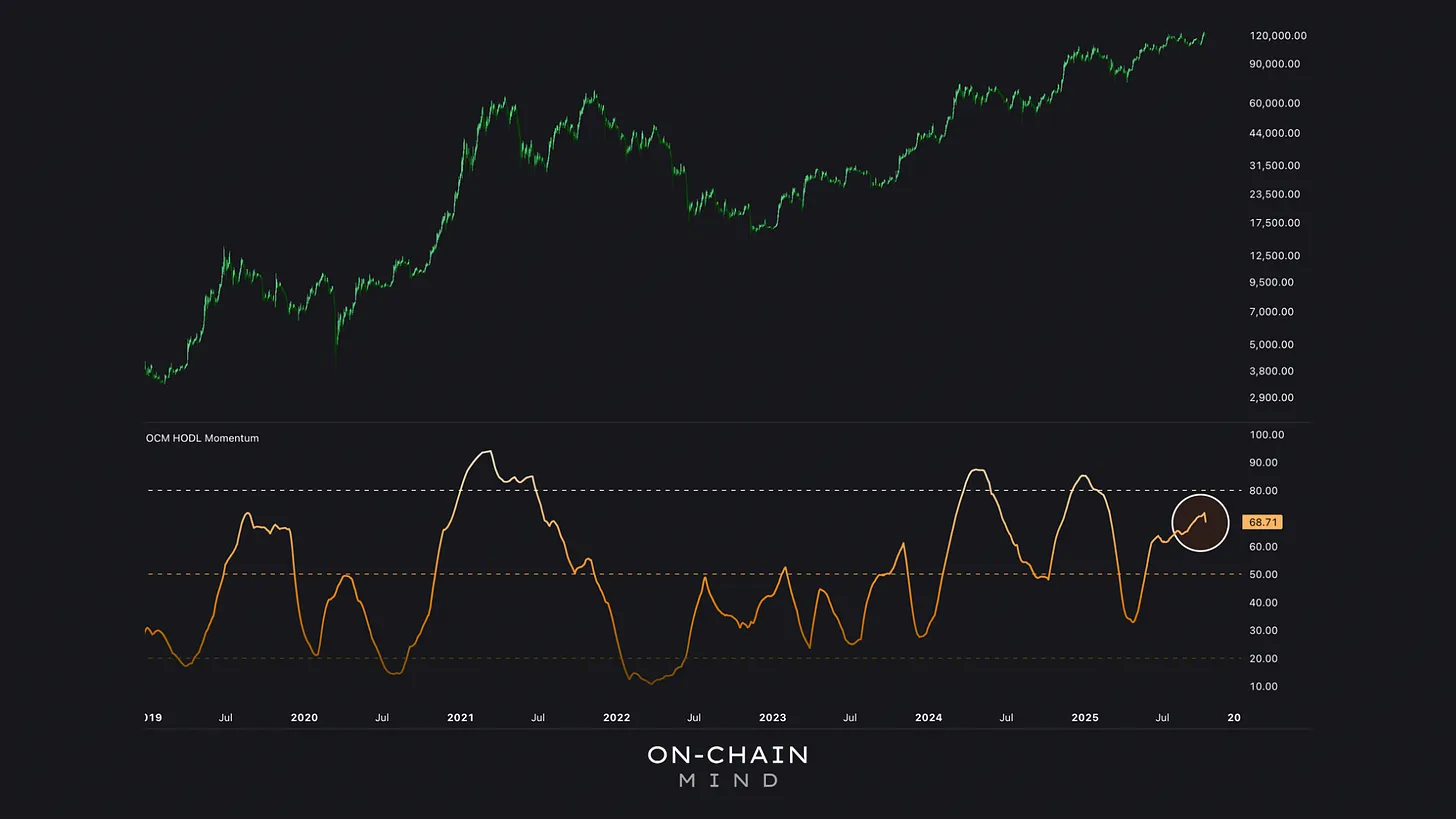 Currently, HODL Momentum sits around 68 — elevated, but not extreme.