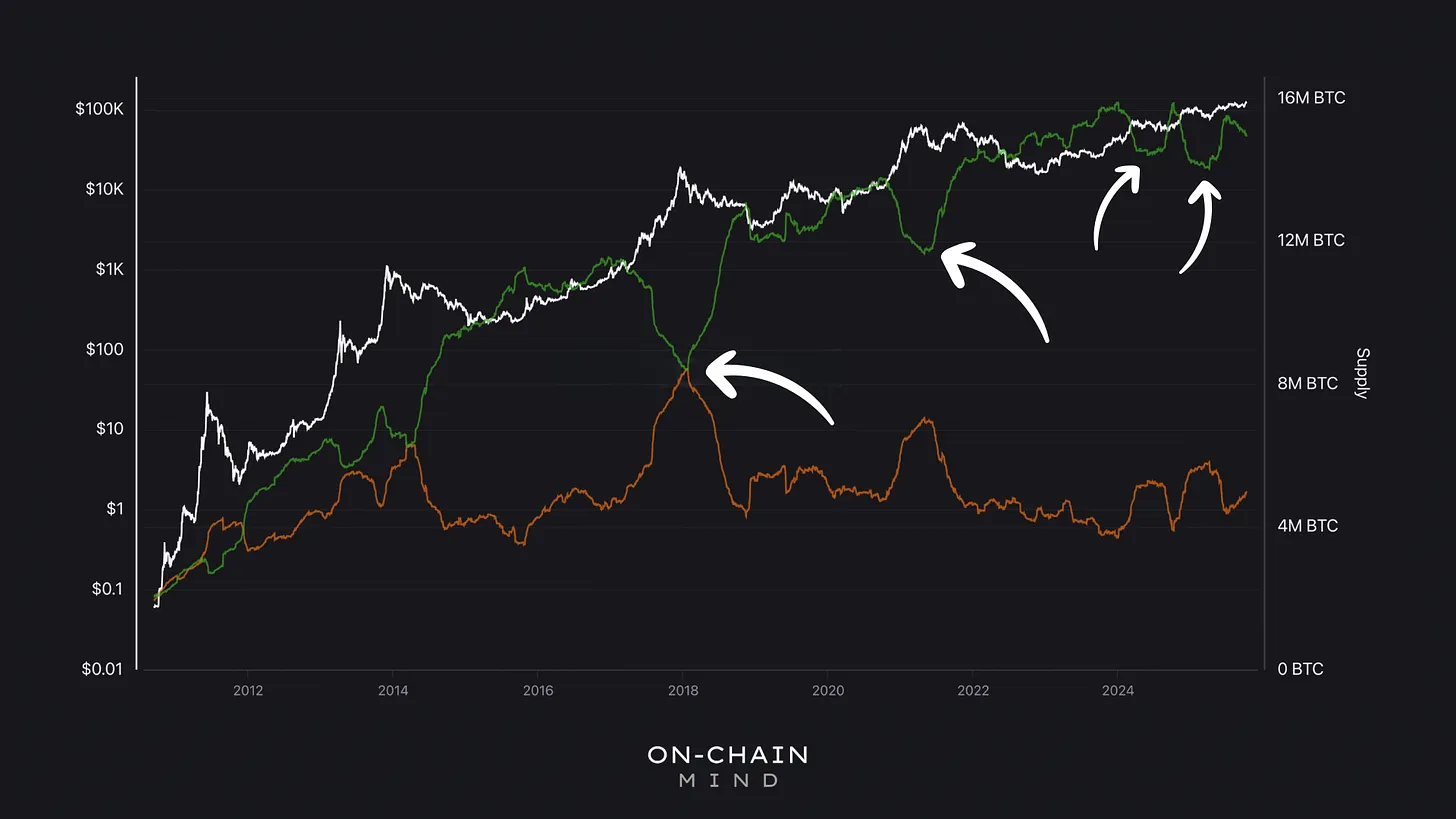 Yet, with LTHs still commanding 75% of supply, we’re far from the parity seen in prior tops. This suggests the cycle may have legs — prices need to climb further to lure more distribution from this cohort.