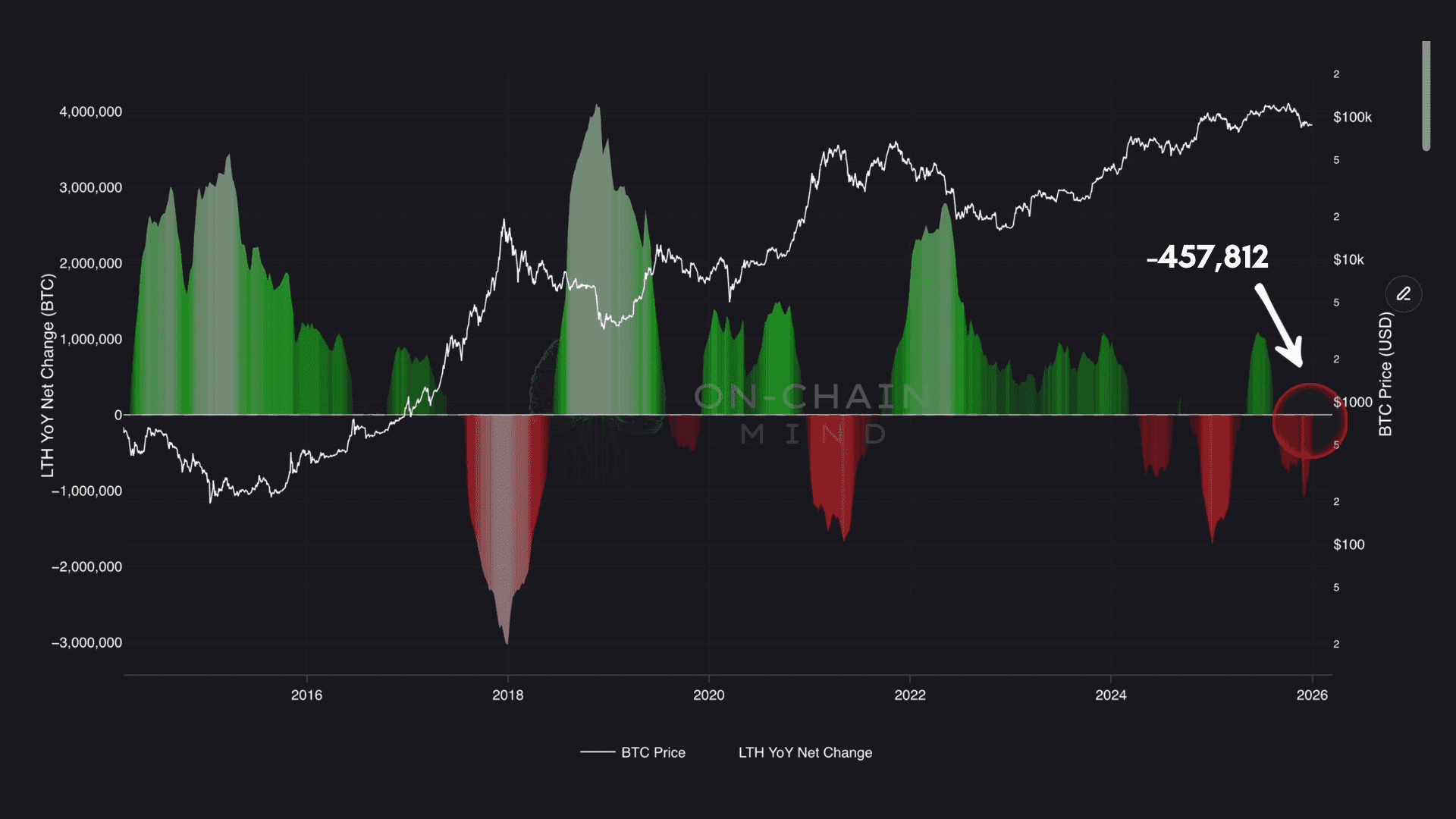 At present, the year-over-year reading still sits firmly negative at around -457,000 BTC. That means that the long-term holder balance, in aggregate, is less than what it was compared to a year ago.